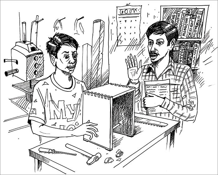 मी (प्रा. नाडकर्णी) नेहमीप्रमाणे त्या लाकूडकलेच्या कार्यशाळेतून कॉफीमध्यांतर वेळात फेरफटका घेत होतो. त्या लाकडी करवत भुश्यातील ढिगातून विवेक हा विद्यार्थी अतिशय बारकाईने कातडी तिपाई (स्टूल) जे वार्षिक प्रदर्शनाच्या स्पर्धेत मांडण्यासाठी सॅण्ड पेपरने घासून पूर्ण करण्याच्या गडबडीत होता. ते अतिशय सुबकपणे चौकोनी घनाकृतीतून निर्माण केलेले होते. त्याचे तिन्ही कोपऱ्यांचे पृष्ठभाग नीटपणे सांधलेले होते. दंडगोलाकार लाकडी दोन उभ्या पृष्ठभागास खालच्या बाजूने बांधलेले होते.