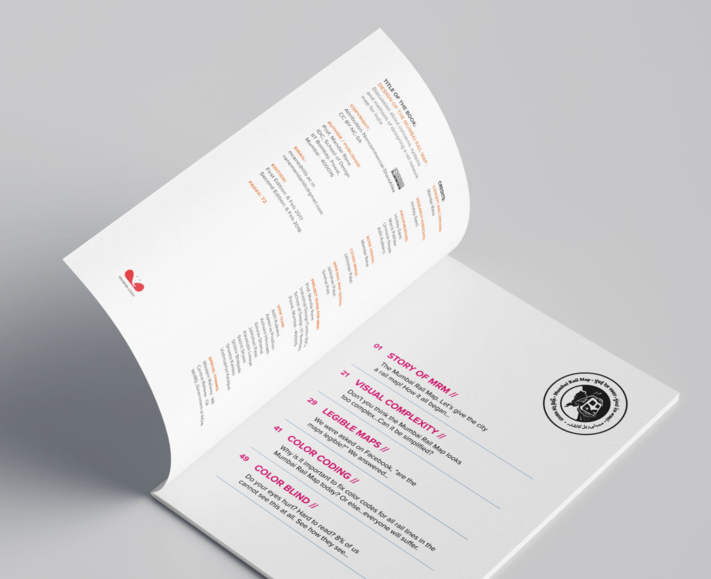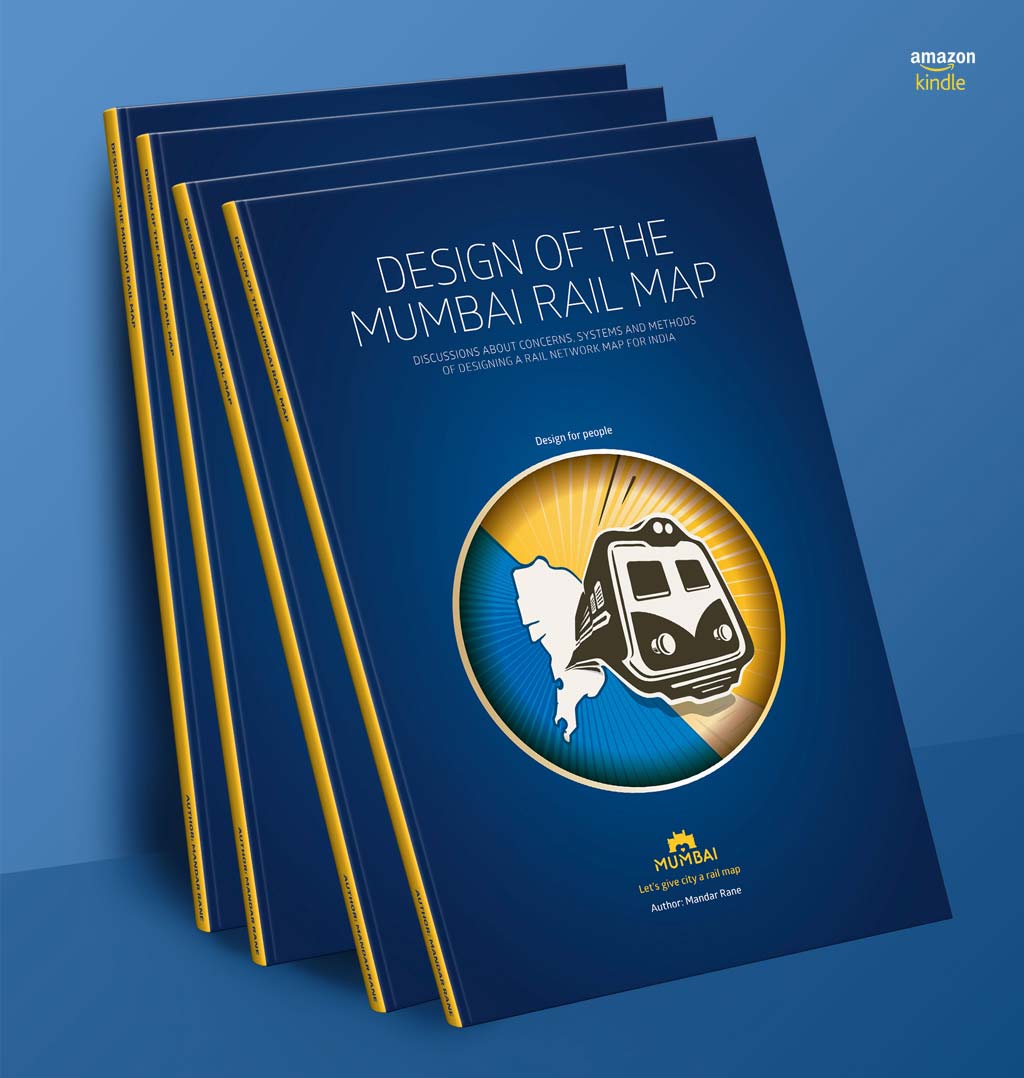 The design of the Mumbai Rail Map is a book in five parts. It begins with a short conversation about identifying the need for a rail map, followed by the process of creating a map from scratch and design decisions through its five subsequent iterations. The MRM, like many rail maps across the world, appears too complex to engage with. The second section of the book delves into the issue of complexity and elaborates how complexity can be tamed through tools available to the information designer. The third section of the book is an objective dissection of the readability of MRM maps installed at Bandra and Dadar stations. Section four focuses on the need to establish a system of colors for each line in the network; a system if not adopted in time will lead to chaos. The last section of the book delves into the nuances of designing information systems for individuals with color-blindness and illustrates the need for designers to be aware of concerns for information systems to be inclusive.