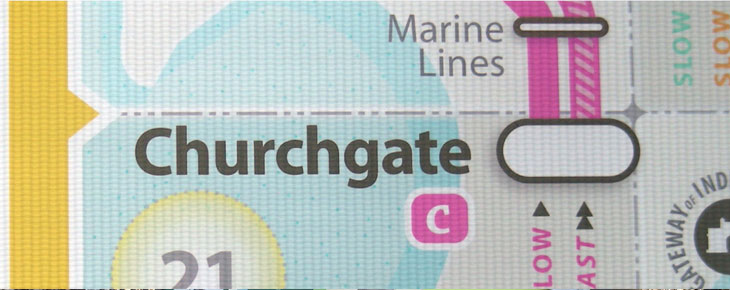 This brings us to another important factor that determines readability, contrast. Intensity of 100% black text is reduced to 80% grey, due to the extra brightness of LED (see the word Churchgate in Image 3). That means the 60% grey text goes for a toss and the pastel shades of line colors also get washed off. Therefore it affects readability when flex is lit by powerful LEDs. Advertisements do not face this issue as they have larger text and bold images when compared to a map. If this will be the final medium for displaying the maps, the artworks shall have to be altered to compensate for the reduced contrast or else the intensity of the LED lights should be reduced.