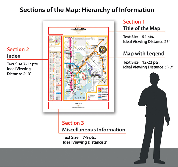 When a user is far away from the display, he must be able to read the title and see the map, which is why these are the most dominant sections (see Section 1 in Fig. 1). Once the user comes closer, he should be able to read the map and find his station using the index, which makes the index and instruction section relatively smaller. If he is interested in the miscellaneous information, he must move even closer to the map.