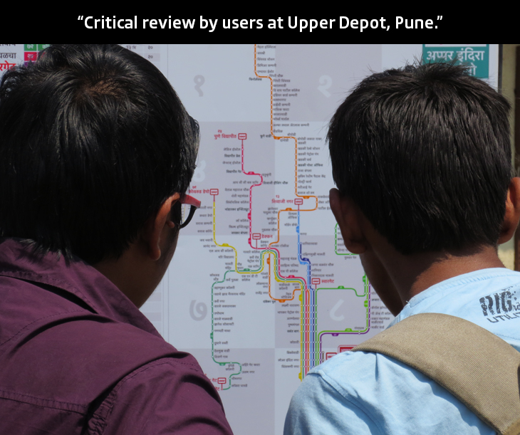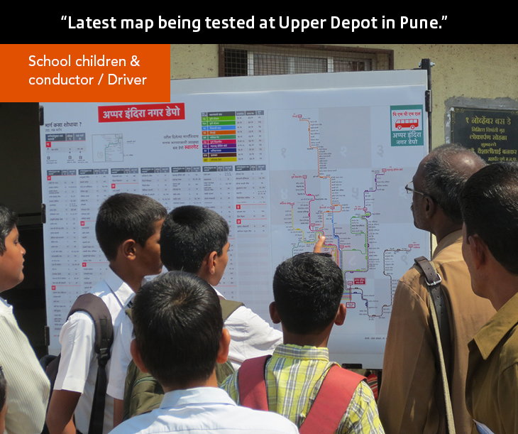 I designed the map for Upper depot, such that you can locate all the buses passing/leaving from Upper depot. Once I completed both the languages we put up Marathi and English maps at Upper depot. People were very keen and were reading the maps as they were never exposed to such a bus -route Map. Maximum people preferred the Marathi map.